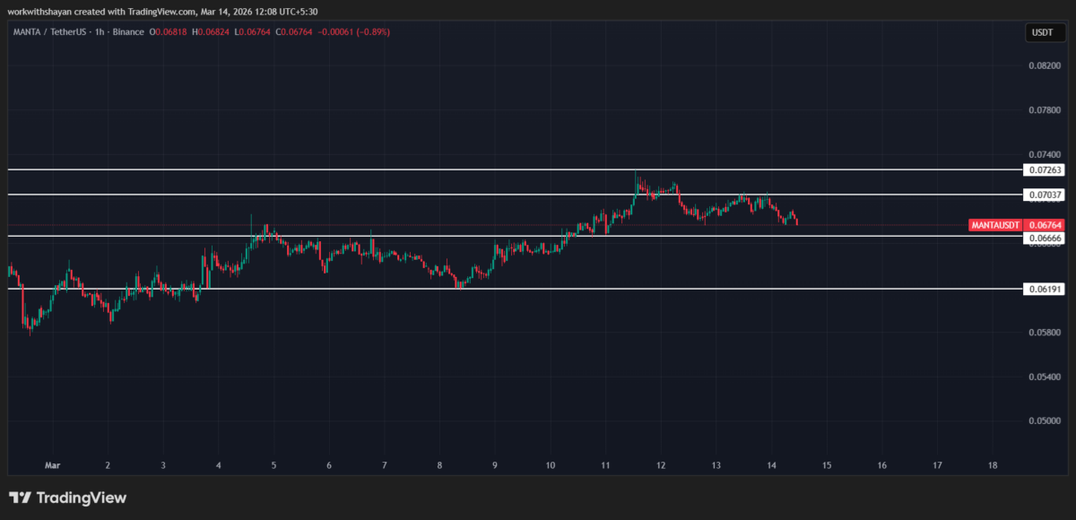 Analyzing the daily price chart of the MANTA token on 14 March, the coin is making a downward push toward $0.068. Currently, sellers are aiming for a hold below immediate Fib levels and they are strongly defending further surges. The 24-hour volume dropped to $403 million, showing a decline in trading activity today. Manta is trading at $0.068, declining by over 3.3% in the last 24 hours.